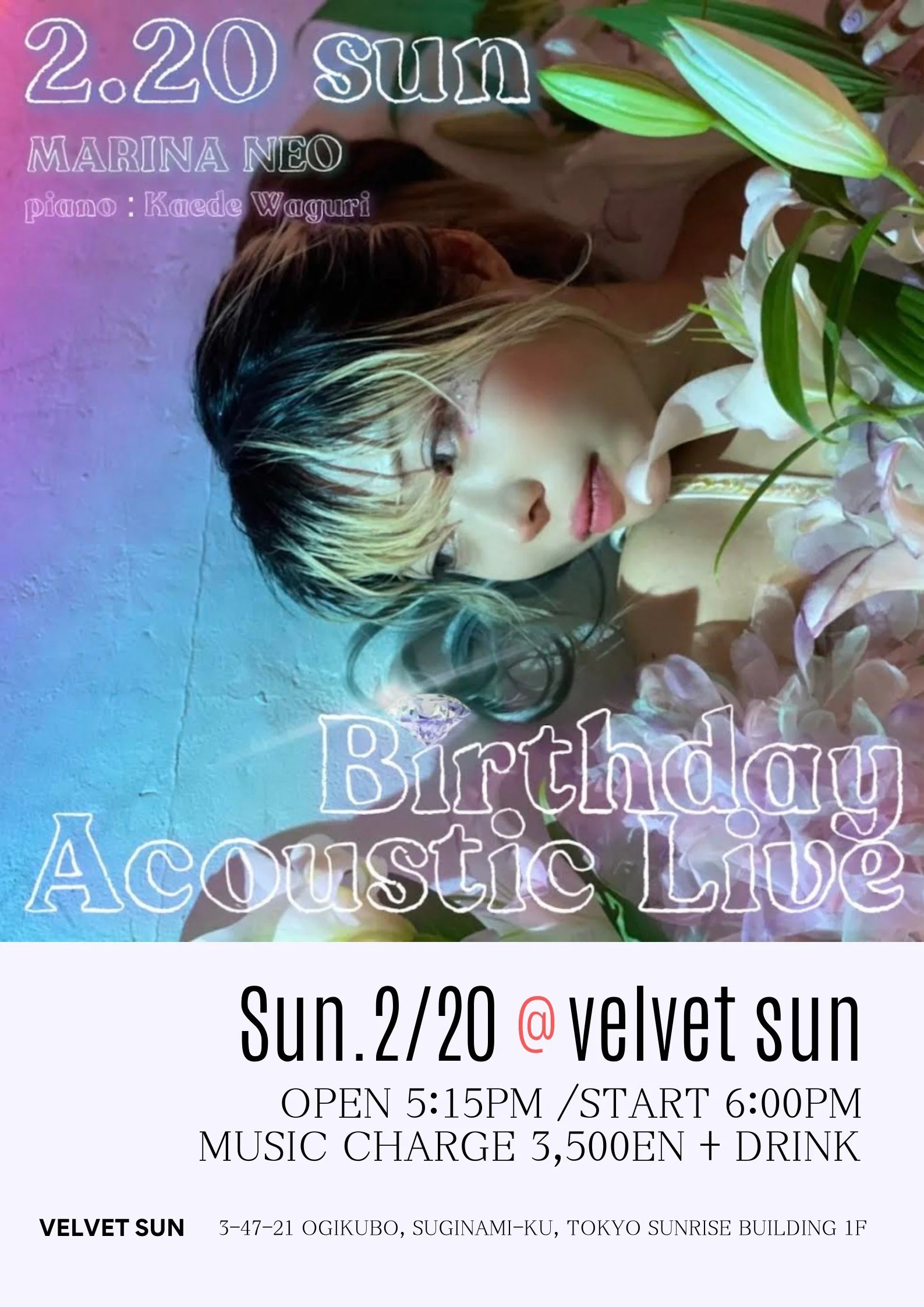 シンガーソングライター MARINA NEO の初ワンマンライブ。誕生日を記念して、グランドピアノアレンジで全編お送りするアコースティックライブです。